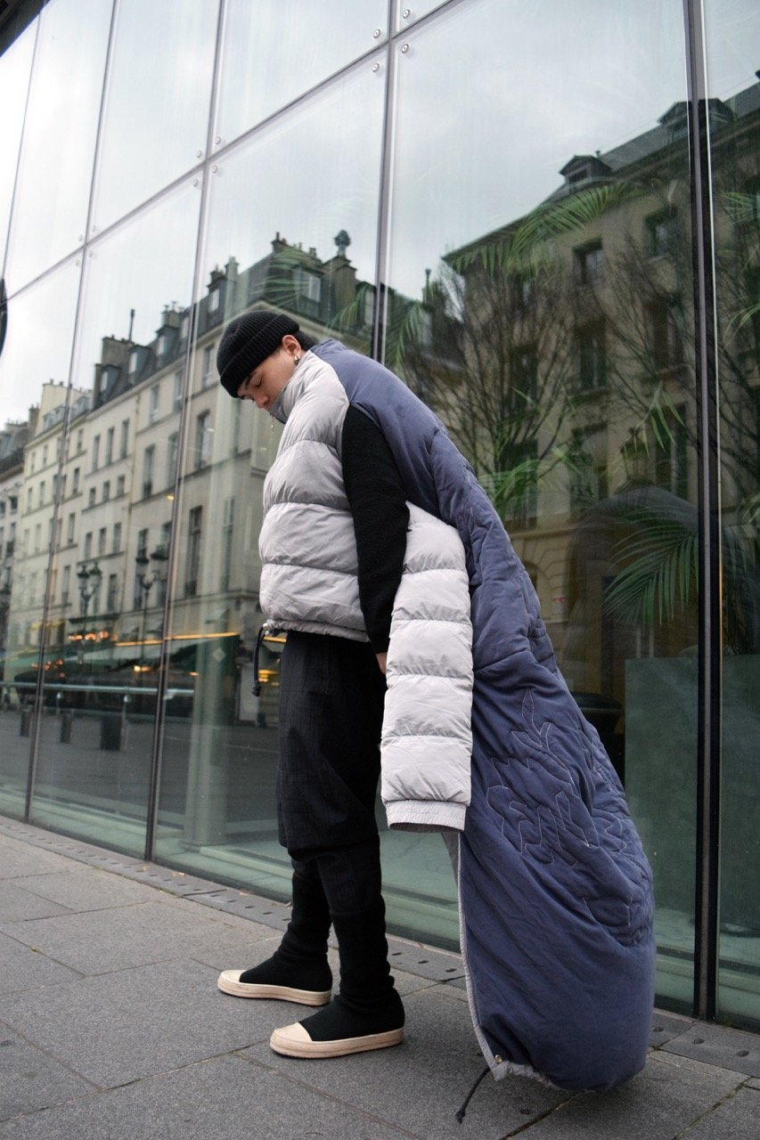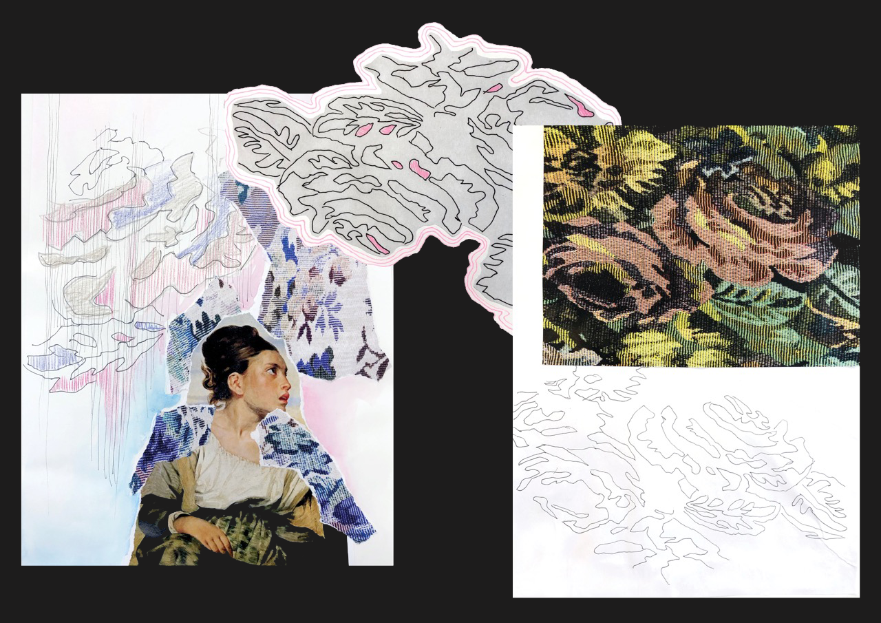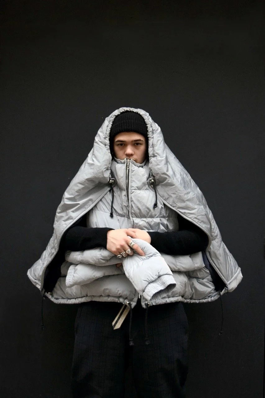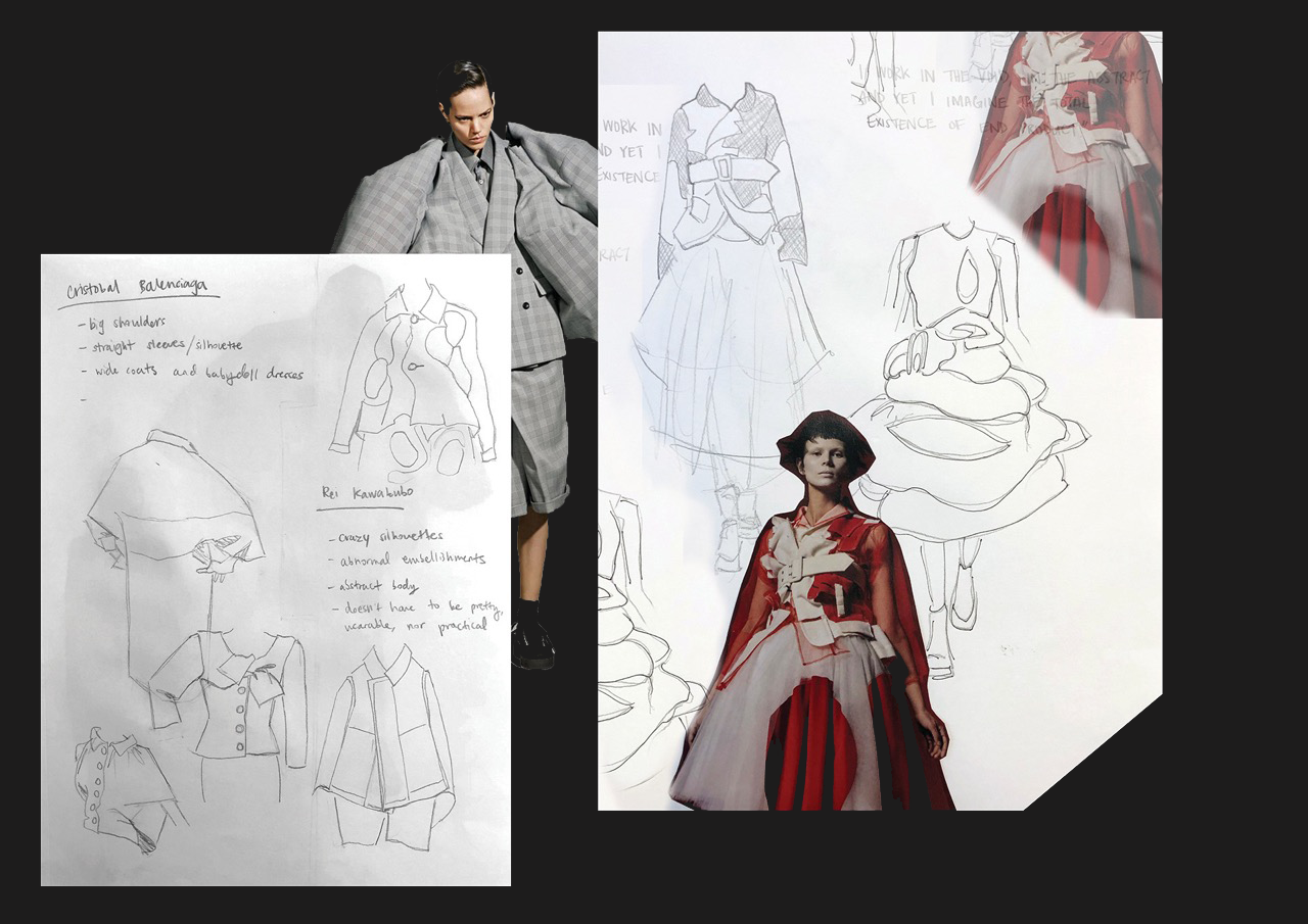 Frameless is a garment based off of the works of Cristobal Balenciaga and Rei Kawakubo. I started off with the silhouette of Balenciaga's fitted jackets with a slim front and a voluminous back. As for Rei Kawakubo, her disregard of the natural human body inspired me to go for an engulfing silhouette and add the illusion of practical sleeves. I intended to make the wearer frameless by eliminating the shoulders and adding significant volume. The back topstitch comes from a tapestry coat I found in Antwerp. The word tapestry is significant to me because that was the name of the street where my most favorite house was. And coincidentally, ту mother loved to cover all of the hardwood floors with tapestry rugs. However, because I'm going for a modern look, I had to modify the tapestry pattern into its simplest form.