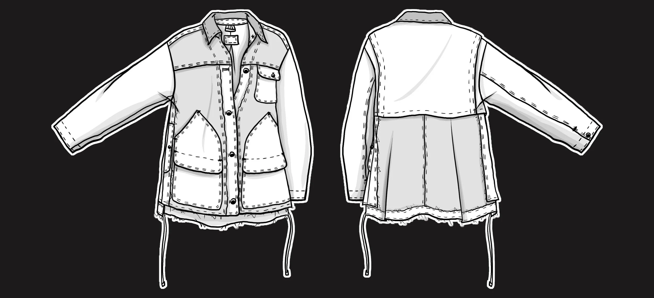 This conversational piece was initially a mock created using a hunter’s jacket, a Carhartt workwear jacket and some printed seed bags sourced from a farm. The pockets were preserved for a utilitarian touch and accent blanket stitches were hand sewn along the cord collar, front closure, sleeves, and hem to match back to the charming aesthetics of the prints.