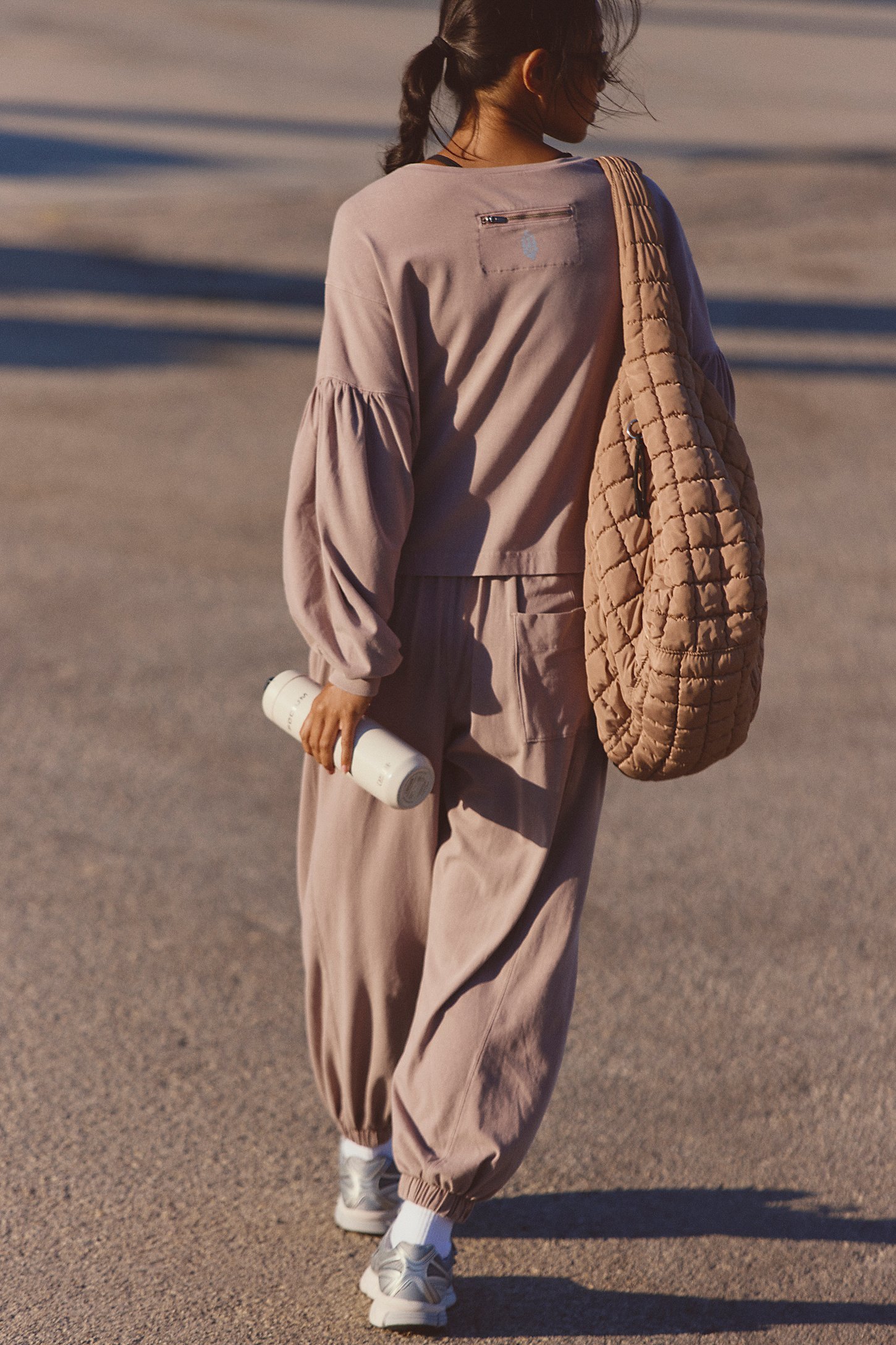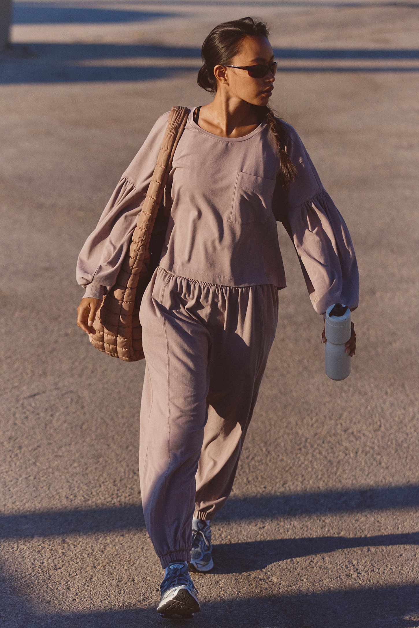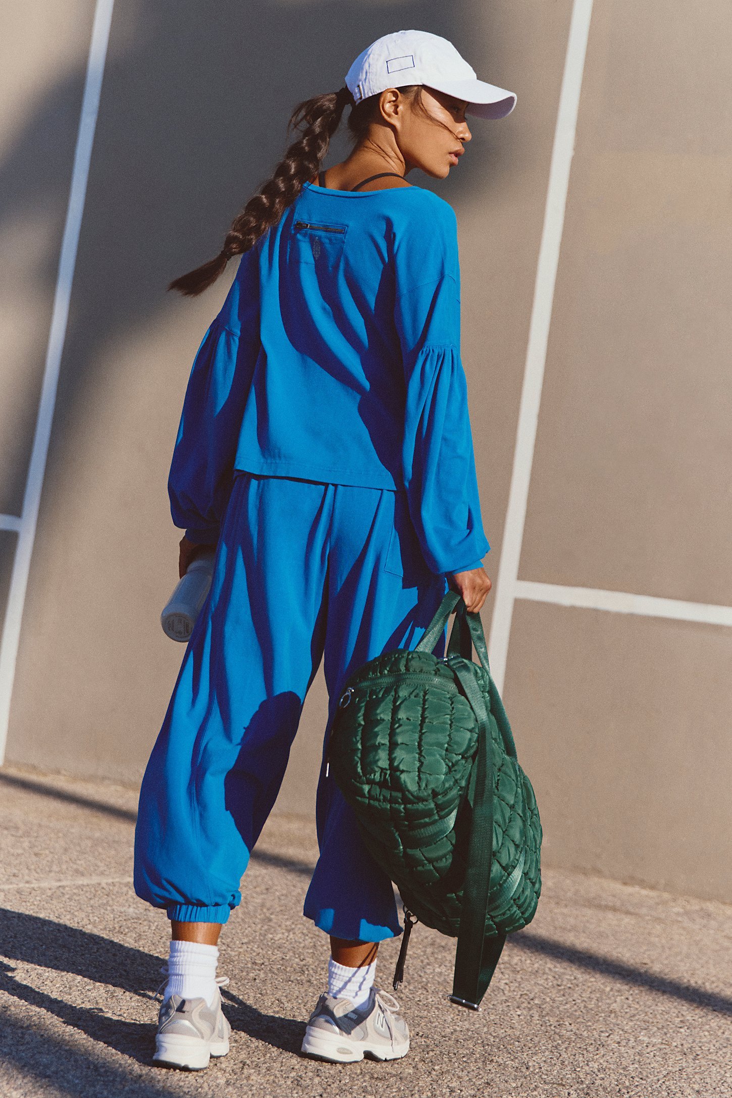 A member of FP Movement’s Hot Shot family, the Recovery Set sports a long sleeve layer with a wide neckline and voluminous sleeves with ruching at the sides that bubble into rib cuffs. The above ankle length pant has an elasticated waistband/cuffs, side seam pockets, and vertical seaming. Asymmetrical patch pockets are added to both top and bottom as well.