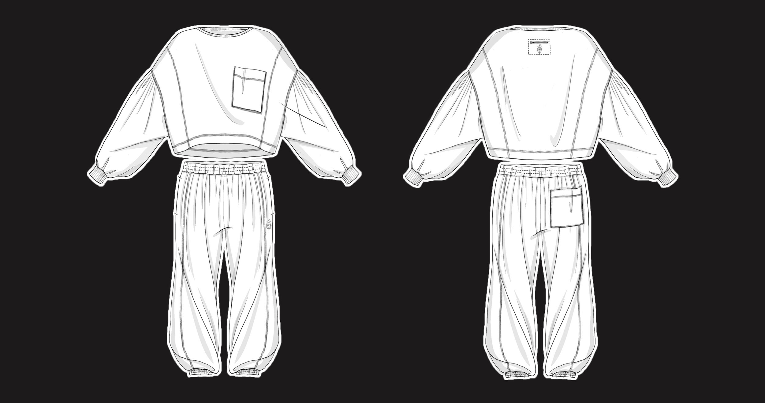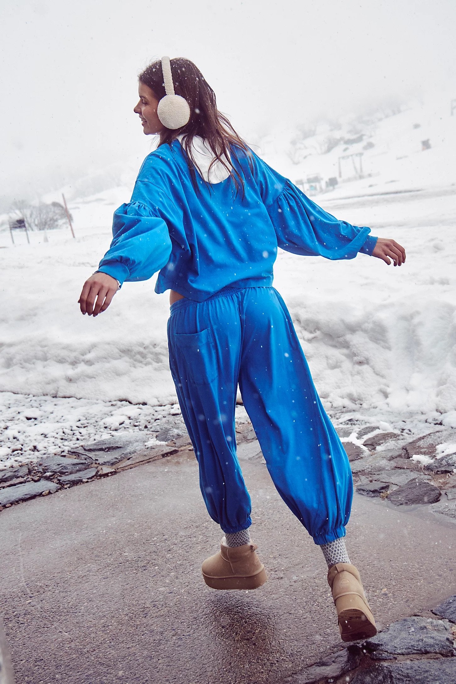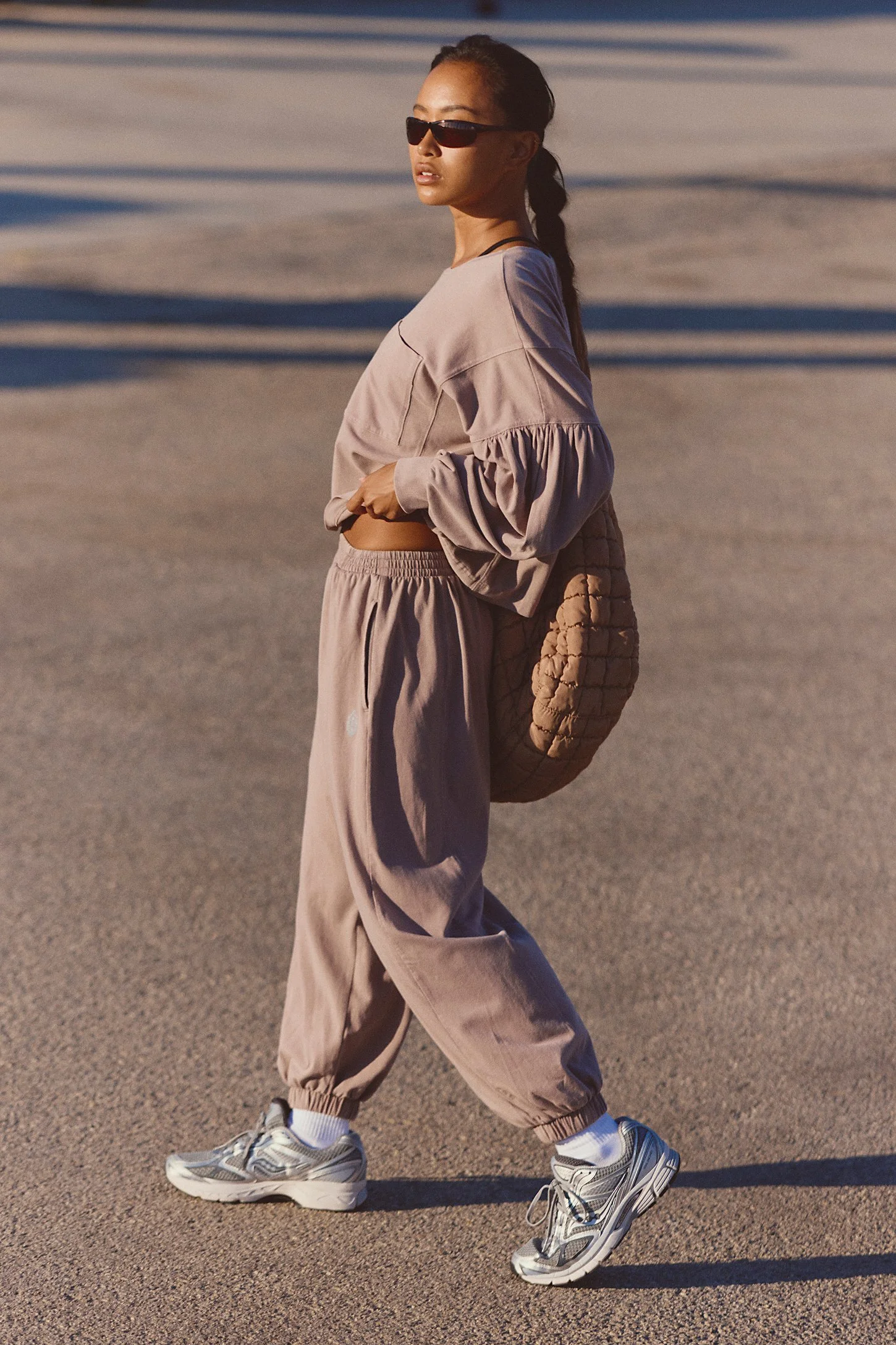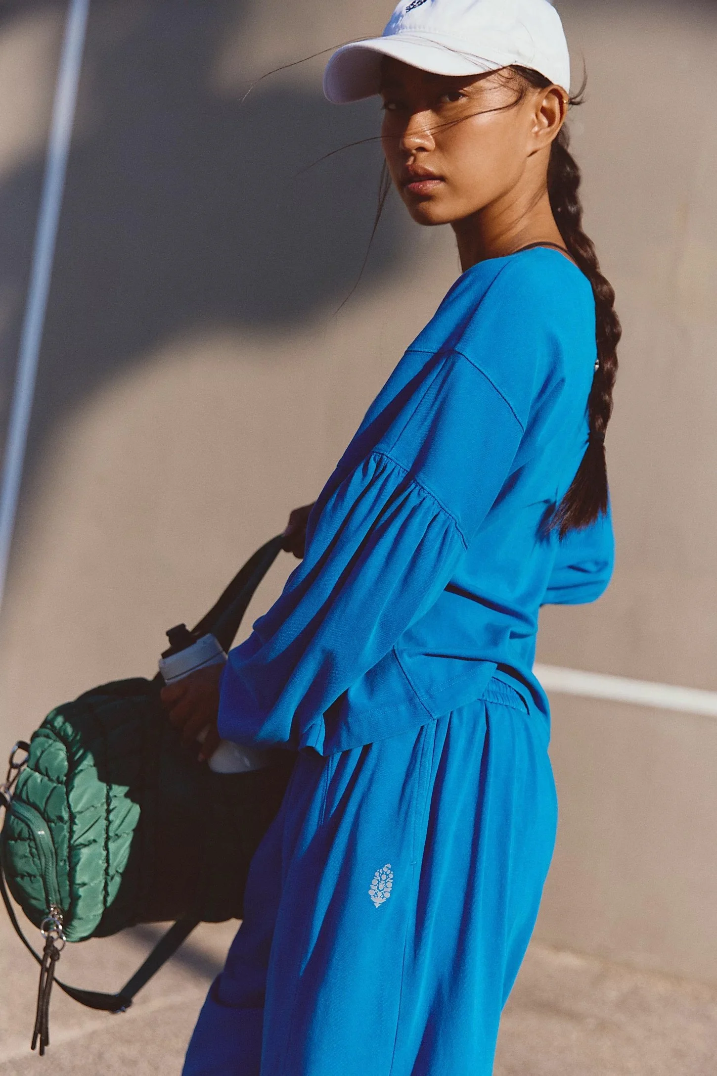 A member of FP Movement’s Hot Shot family, the Recovery Set sports a long sleeve layer with a wide neckline and voluminous sleeves with ruching at the sides that bubble into rib cuffs. The above ankle length pant has an elasticated waistband/cuffs, side seam pockets, and vertical seaming. Asymmetrical patch pockets are added to both top and bottom as well.