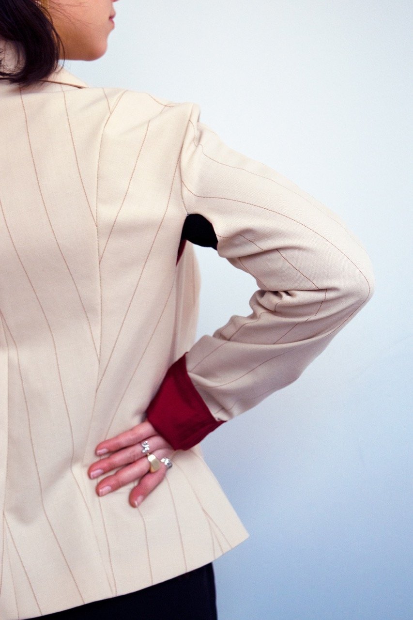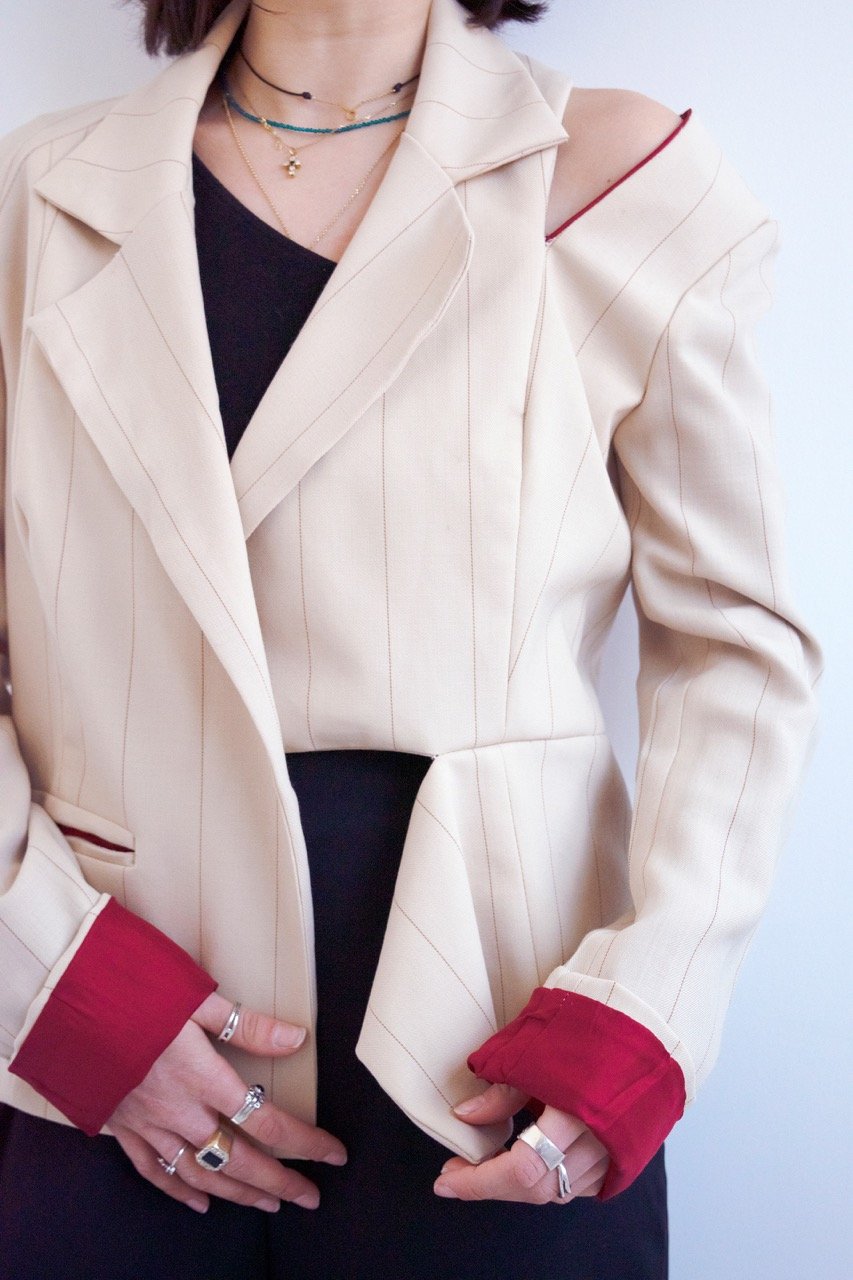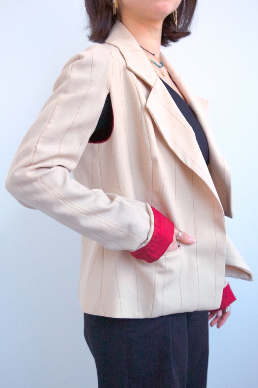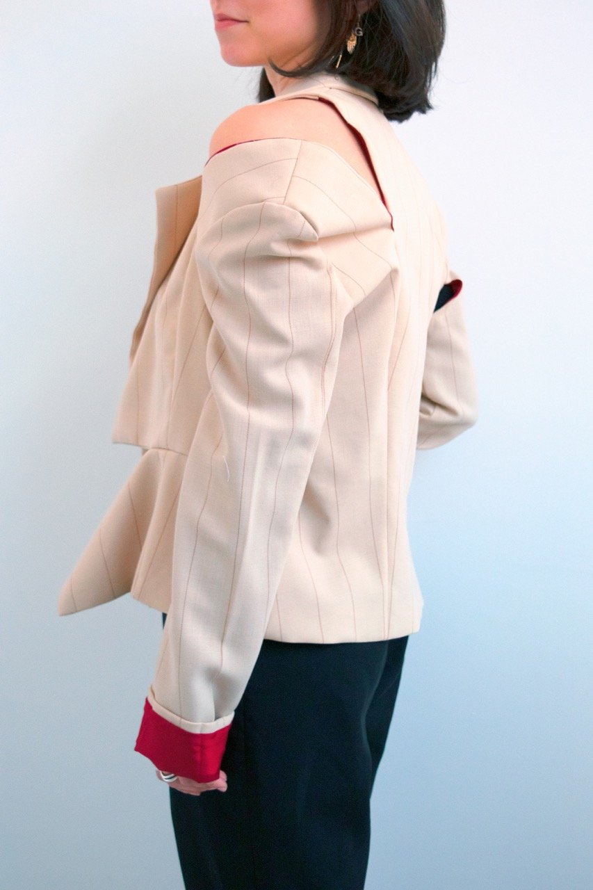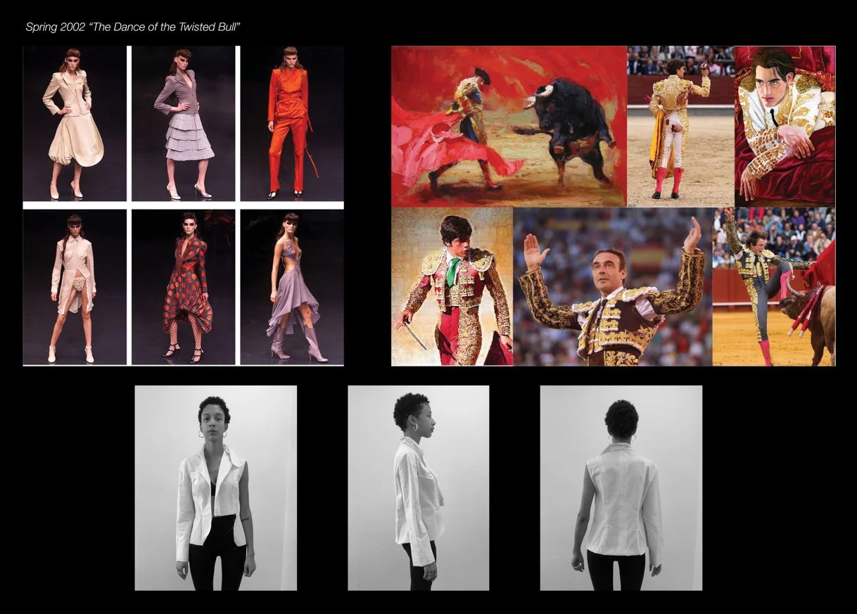 A specialized studio assignment that required a tailored jacket inspired by any one of Alexander McQueen's collections. I chose "The Dance of the Twisted Bull" from Spring 2002 to help me design a fitted matador's jacket that looks as if it's been impaled and ripped up by a bull's horns.