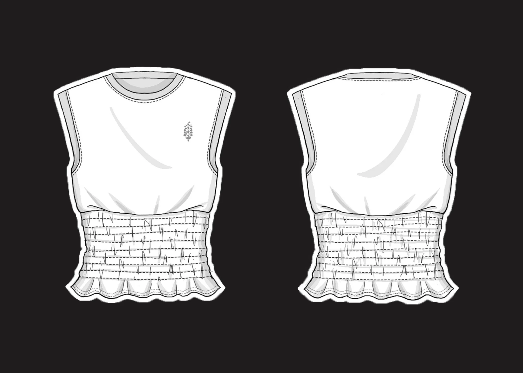 The Prime Time Tank is a fun twist on a basketball jersey with a smocked waist panel and contrast tape binding at the neckline and armholes. The peplum hem adds a femme touch to the silhouette.