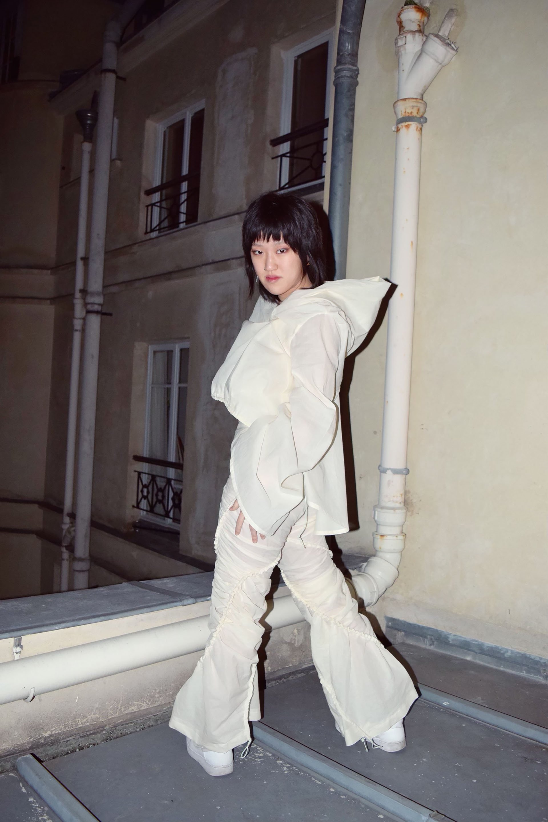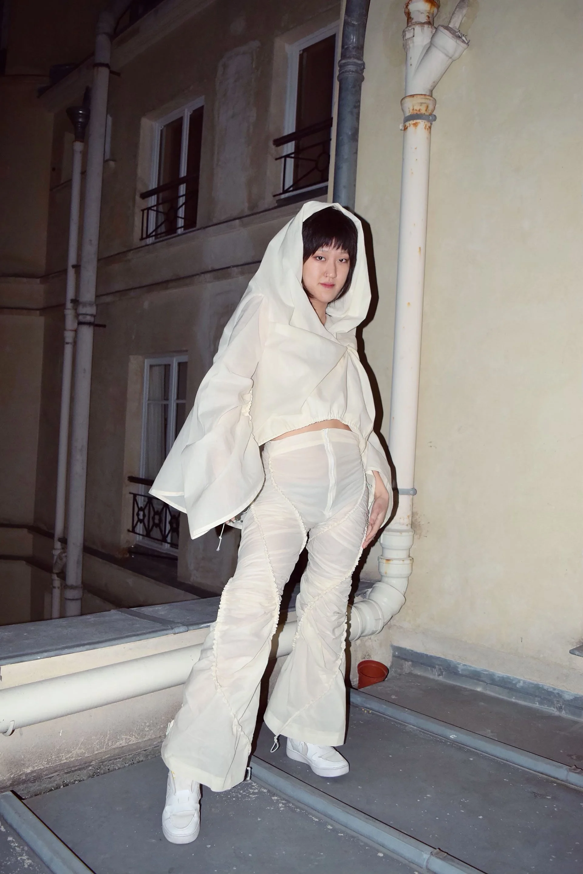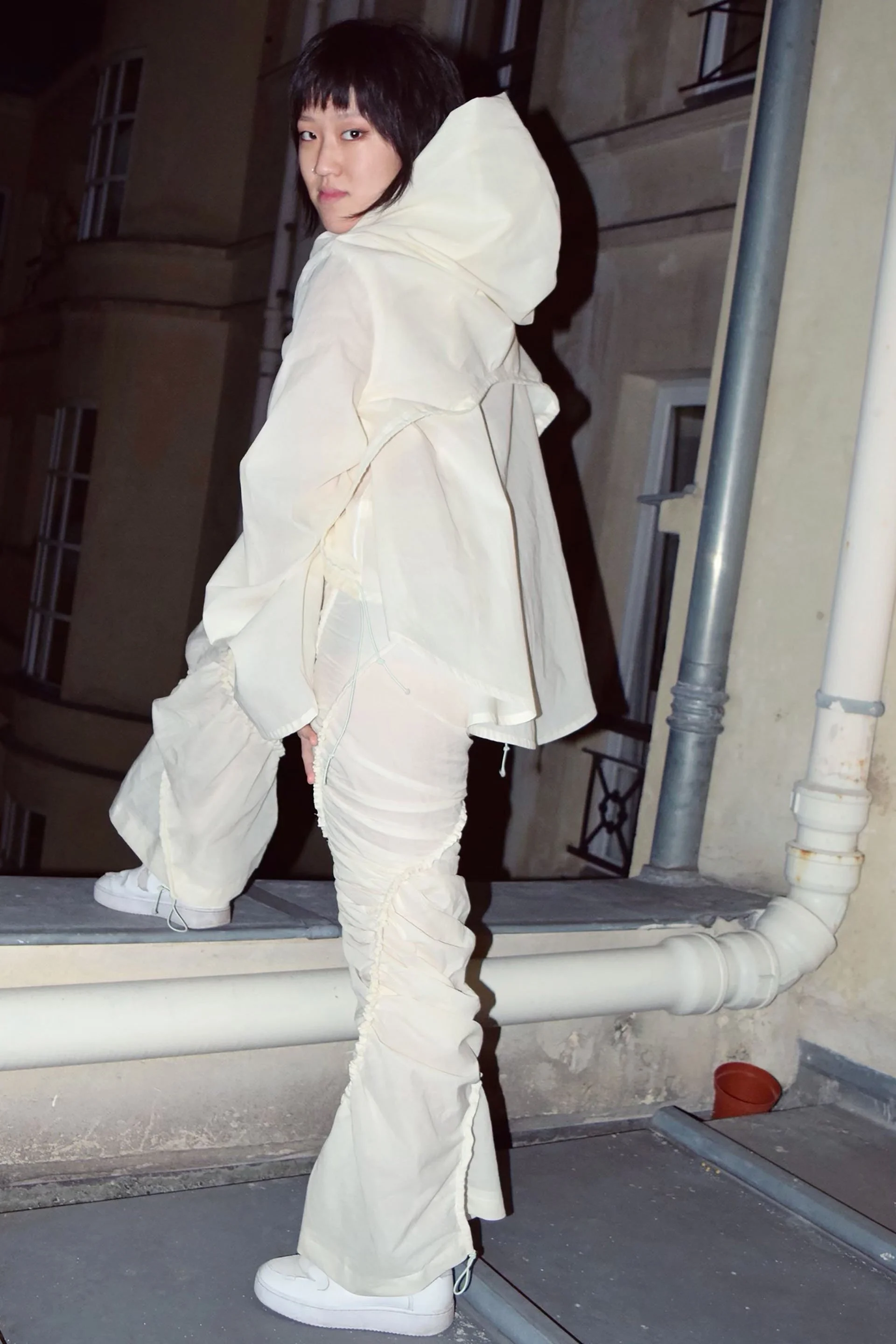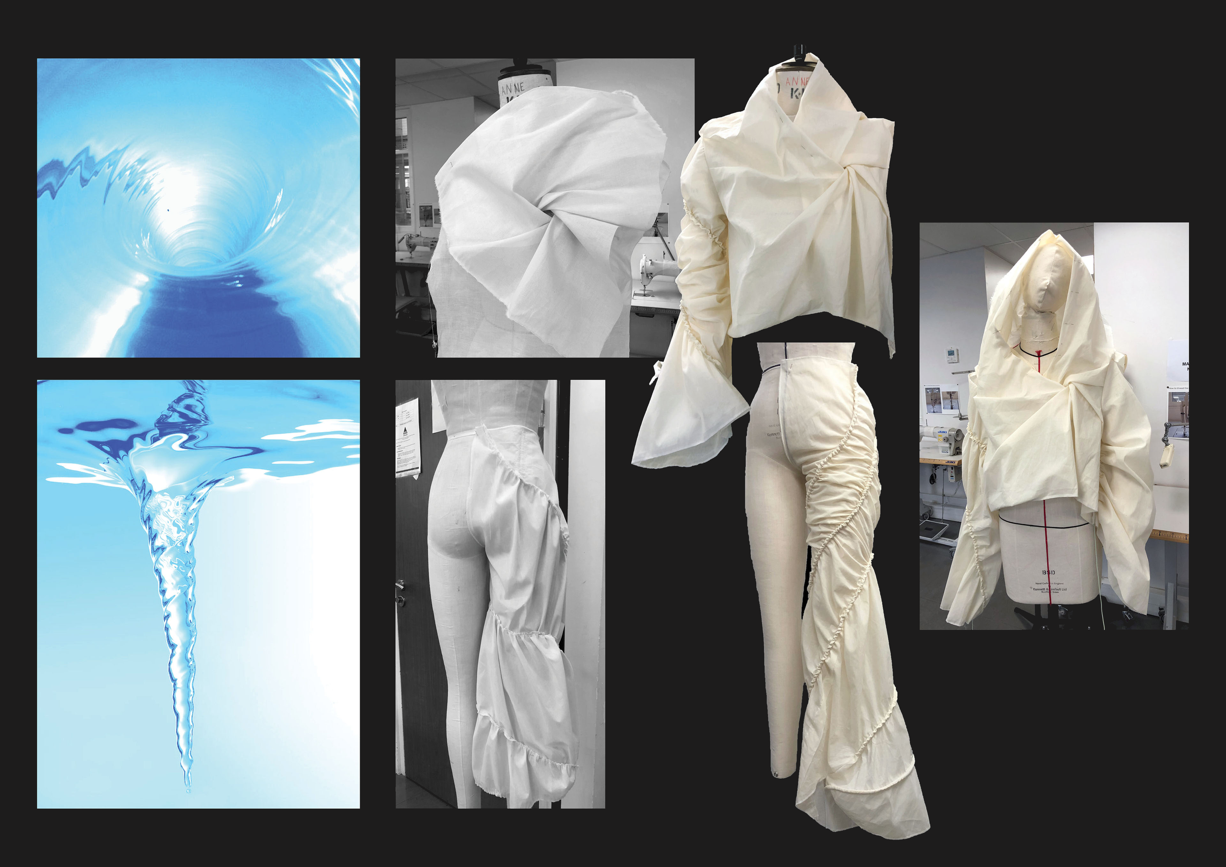 A technical project that required the method of gathering. I chose to create a look inspired by the natural rotating water of whirlpools. I wanted to capture the fluidity and twisting encapsulation of this phenomenon, almost as if the wearer is drowning in the vortex.